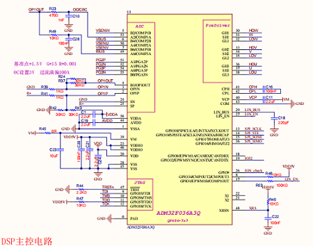 電路模塊主要包括: 輸入防反(預留高邊防反參考電路)及濾波電路部分、ADM32F036A3Q最小系統、功率橋電路、ADC母線電壓采樣電路、單電阻采樣運放采樣電路、和PWM/LIN通訊反饋電路。