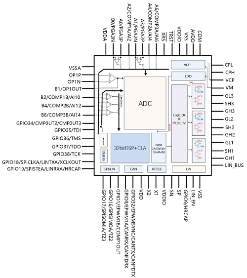 ADM32F036A3Q 是面向電機控制的 32 位 DSP 車規級改進型,集成 LDO、電荷泵和 6NMOS 預驅,搭載 100M 主頻 32 位 DSP 處理核+CLA,增強型控制外設,CAN、CANFD、LIN(帶收發器)、SPI、HRCAP 模塊,12 位 ADC,電壓比較器、溫度傳感器;可構成高集成度電機控制驅動核心,直接驅動功率管完成電機控制,支持有感、無感、方波、弦波等多模式。