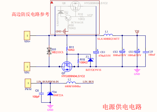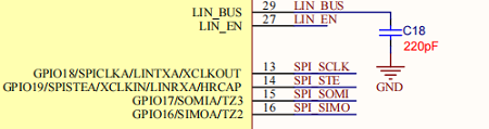 外部輸入PWM/LIN信號,通過芯片內部集成的LIN收發器模塊實現PWM/LIN通訊反饋和通過LIN_BUS和LIN_EN進行遠程休眠喚醒功能。