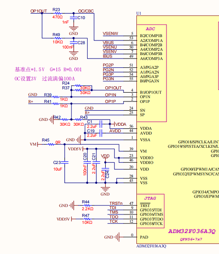 單采樣電阻0.001R,通過差分走線至ADM32F036A3Q的OP1的獨立運放電路進行運放輸入到芯片口采樣進行運算。