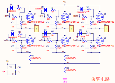 功率橋電路采用上下管均為NMOS的配置,總計6個NMOS組成三相半橋驅動電路。